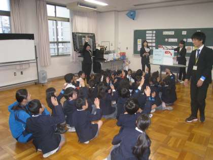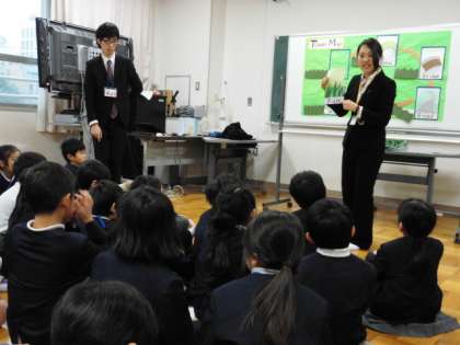1月22日(金)、29日(金)の5、6時間目に2年生も外国語活動の体験授業を行いました。1時間丸ごと英語だけで行われる授業では、簡単な文章を歌やダンスに合わせて発音したり、グループやペアでゲームを行ったりすることで、自分から英語を使って相手と交流する楽しさを感じることができました。