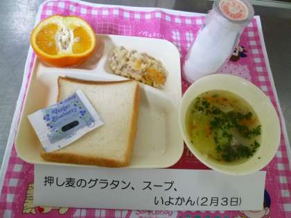 今日は節分、明日は立春です。家庭や地域の行事で豆まきをしたり恵方巻きを食べたりする方も多いと思います。給食メニューは、食物繊維がたっぷりの押し麦のグラタンでした。デザートに愛媛産のいよかんが一人2分の1個もつきました。ビタミンCをたっぷりとって、かぜを予防することができますね。