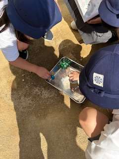 雨が降った後の地面を観察して、水が流れたところや水たまりになっていたところをみつけて、ビー玉を使って地面がかたむいていることを確かめました。