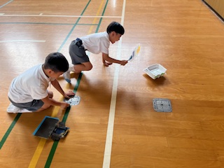 図工科で作った作品をうちわでパタパタ仰いで楽しみました♪風を受けてスイスイ進むものや、はねるものなど、色々な動きを楽しみました!