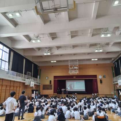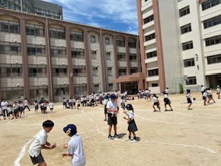 1.3.6年生は運動場で「ジャンケンリレー」を、2.4.5年生は講堂で「先生クイズ」をしました。