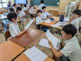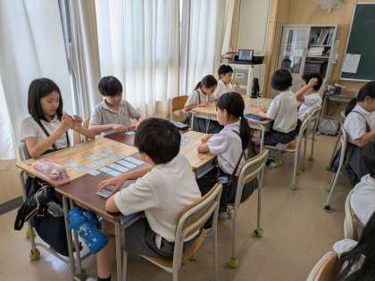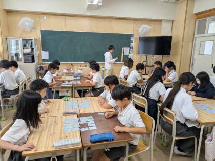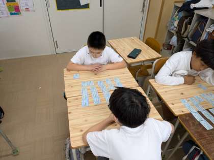 5年生の教室には、百人一首を楽しむ子どもたちの声が響いていました。子どもたちは真剣に読み札の言葉に耳を澄ませ、取り札を必死に見つけていました。