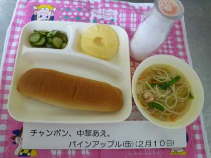 体があたたまるチャンポンには、焼き豚やえびが入っていました。えびのアレルギーがある児童には、えび抜きのメニューが出されました。久しぶりに缶詰めのパインアップルが出ました(もちろん国産です)。