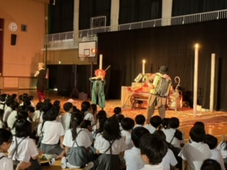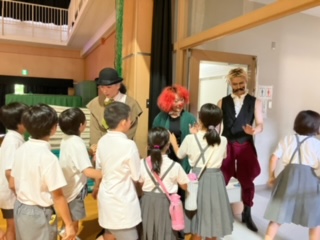 音楽家と道化師による言葉(せりふ)のない舞台。面白おかしいピエロの動き、ジャグリングのような技、そしてストーリー性のある内容まで、身体によるたくさんの表現や、ピアノ、フルート、バイオリンの楽器演奏まで、みんな見入っていました。