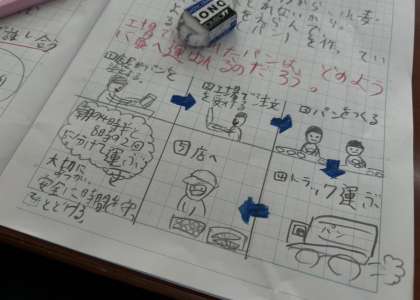 パンを作る過程や、工場からお店に運ばれる流れを絵や文字でしっかりノートにまとめています。