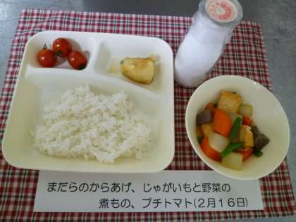 まだらは、カリッとあがってたれの味がしみて米飯によく合いました。煮ものはあたたかくてじゃがいもやだいこんがほくほくしていました。