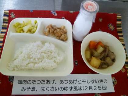 家庭では食べる機会が少なくなっている「干しずいき」が煮ものに入っていました。お湯で戻して何度も水洗いし、あくを抜いて調理しているので、味がしみておいしかったです。鶏肉のたつたあげは、児童に大人気でした。ゆずの香りのはくさいのおかずはさわやかでヘルシーでした。