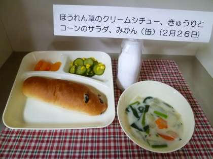 旬のほうれん草を使用したシチューは、まろやかでコクがあり、ヘルシーでおいしかったです。2・3年生で学級休業が出ましたので、いつもより大盛りの給食を、子どもたちは残さずに食べてくれました。