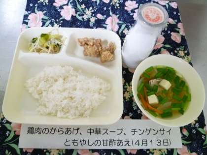 鶏肉のからあげはカリッとあがっていて大人気でした。スープには、しいたけやにら、豚肉、とうふなどが入り、ヘルシーでした。チンゲンサイともやしの甘酢あえはさっぱりしていて、1年生の児童にも意外に人気があり、「おいしかったよ、毎日もやしが出たらいいな。」と喜んでいました。