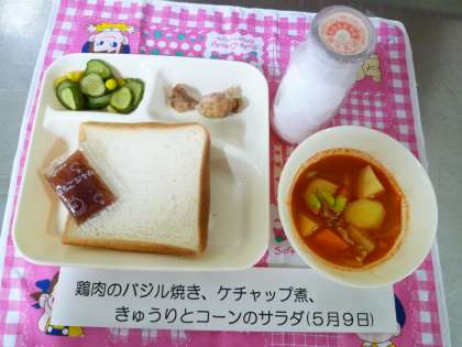 鶏肉のバジル焼きは、スパイシーで肉がやわらかく、おいしくいただきました。ケチャップ煮には、じゃがいもやにんじんがたっぷり入っていました。サラダには、コーンが入って鉄分がとれました。