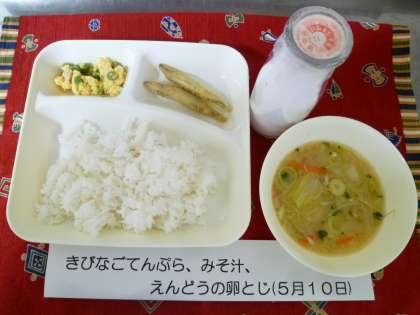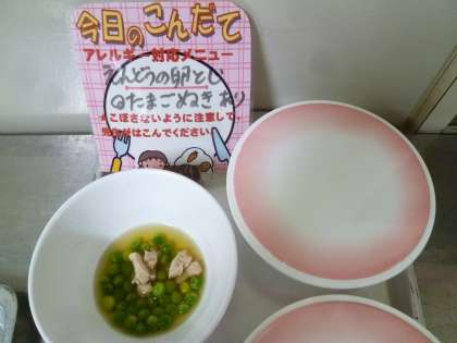 旬のえんどうを卵とじにしたものがでました。大きなたらいに2杯もあるえんどうのさやを3人の調理員でむくのは、時間がかかってたいへんでしたが、旬の味を楽しんでもらおうとがんばりました。卵アレルギーの児童には、卵抜きの除去食が提供されました。