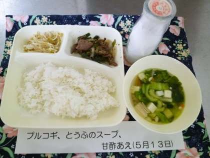 プルコギにはピーマンが多めに入っていましたが、肉のうま味で子どもたちはよく食べていました。とうふのスープは、焼き豚のうま味が出て野菜をおいしく食べることができました。