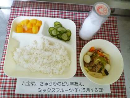 八宝菜には、うずら卵が入っていますが、卵アレルギーの児童には除去食が提供されました。桃や梨、みかん、パインなどの入ったミックスフルーツがつきました。
