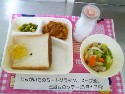今日はポピュラーな食パンにマーマレードがつきました。じゃがいものミートグラタンは、焼き物機でこんがりと焼かれ、おいしくて大好評でした。スープ煮と三度豆のソテーは、にんじんやコーンで彩りもよく、野菜がたっぷりとれてヘルシーでした。