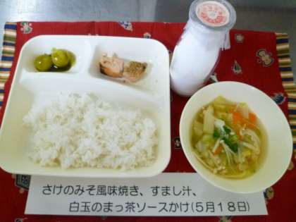 今日は、学校給食献立コンクールの入賞献立で、西淀川区の児童が考えたメニューです。さけは、ごまやみその効果で香ばしく焼けていました。すまし汁はだしこんぶとけずりぶしでていねいにとっただしの香りがよく、たけのこやにんじんなど多種の野菜が入っていました。新茶の季節に合わせて、抹茶入りの手作りデザートがつきました。