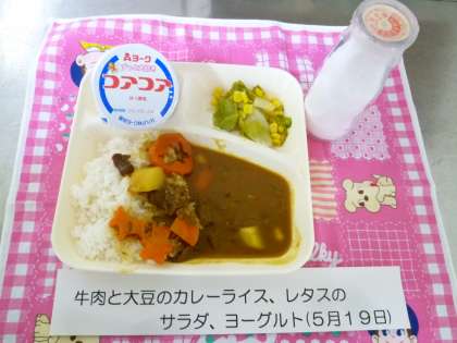 大人気のカレーライスは、国産牛肉と北海道産の大豆が入っていました。レタスは、風呂おけにいっぱいほどの大量でしたが、何度も水を替え洗って調理すると、かさが減ってちょうど良い量になりました。デザートのヨーグルトも人気でした。