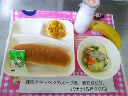 ギョウザの皮の上にコーンやピーマン、チーズなどをのせ、オーブンで焼いた「変わりピザ」はパリパリと歯ごたえよくおいしくて大好評でした。コッペパンはふわふわでした。朝暗いうちからたくさんのパンを焼いてくださるパン屋さんに感謝していただきました。