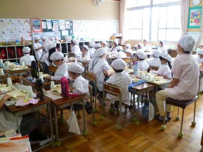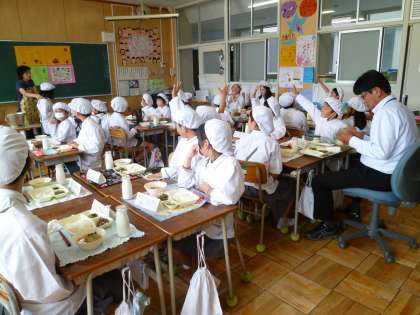今日から食育週間の交流給食がはじまりました。3年生と5年生の児童が半分ずつ入れかわり、校長先生や給食調理員さんも一緒に給食を食べました。給食委員会の児童がポスターを用意し、マナーを守って楽しく食べるように呼びかけました。火曜日が2年生と4年生、金曜日が1年生と6年生の交流給食です。お楽しみに!