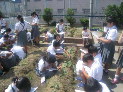 4年生がへちまとひょうたんの成長の様子を観察しました。子どもたちは、春に植えたへちまとひょうたんの成長の様子を熱心に描き、気づいたことをしっかりメモしていました。