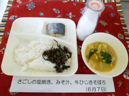 さごしはふっくらと焼け、かぼちゃの入ったみそ汁もおいしかったです。牛ひじきそぼろには、きざんだ青じそが入っているのでさわやかな香りがして、米飯が食べやすく、好評でした。