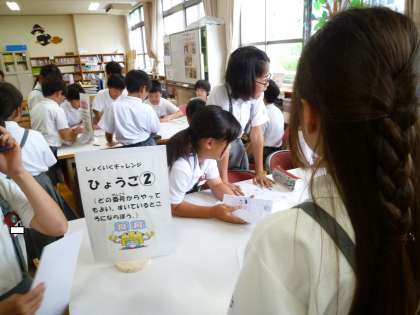 休み時間に図書室で食育チャレンジをしました。あか・き・みどりの三色食品群を子どもたちはとてもよくおぼえていて、クイズまで全部できた人が15人もあらわれました。