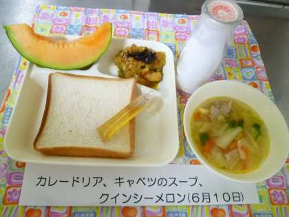カレードリアは、リゾットのようにやわらかくて食べやすかったです。スープにはパセリも入って彩りが良く、大きなクインシーメロンは熊本産で甘かったです。