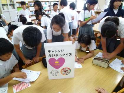 食育週間最後の食育チャレンジは5年生でした。図書室で三色栄養の標語をおぼえたり、赤・黄・緑の食品クイズにチャレンジしました。15名以上の食育チャンピオンがあらわれました。頼もしいですね。給食委員会のみなさんは、1週間、みんなのお世話をとてもよくがんばりました。