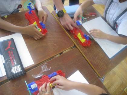 理科では、電気のはたらきについて、プロペラカーの製作を通して学習しました。電気の通り道となる回路の仕組みや、電池の±を逆にした時の様子について理解を深めることができました!