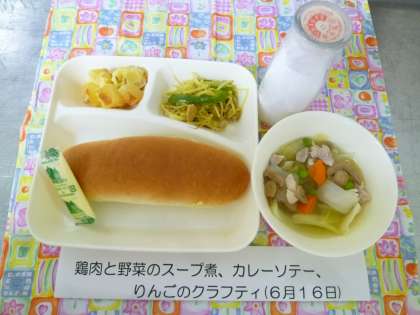 スープ煮は、具だくさんでボリュームがありました。カレーソテーはきれいな色に炒められていました。手作りデザートのりんごのクラフティは、大好評でした。