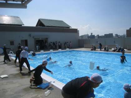 服を着たまま、いつものように水中で活動できるかを確かめ、ペットボトルなどを使って、いざというときに自分の命を守る方法について学びました。