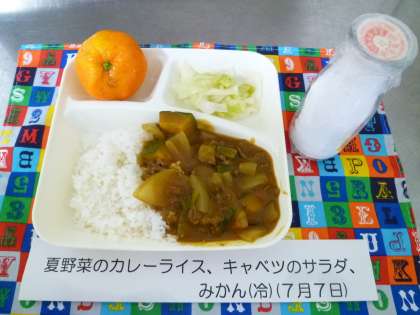 子どもたちに大好評のカレーは、かぼちゃ、なす、トマト、ピーマン、セロリなどの入った夏野菜のカレーライスでした。苦手な野菜もしっかり食べていました。冷凍みかんはひんやりして暑さがやわらぎました。