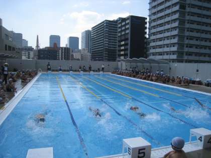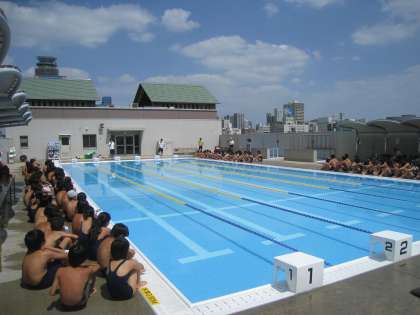 夏空のもと、西天満小学校、菅北小学校の6年生を招いて、水泳交歓会を行いました。
