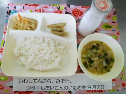 2学期最初のメニューは、いわしてんぷら、みそ汁、切り干し大根のいため煮の和風献立でした。久しぶりの給食で、給食当番には少し戸惑う児童もいましたが、無事に残さず食べて、みんな「おいしかったよ」とあいさつしてくれました。