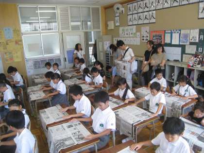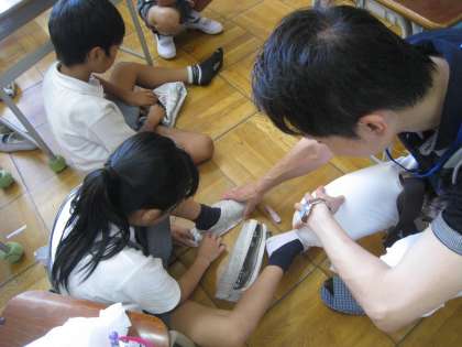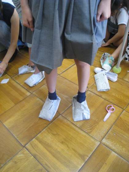 3、4、5年生は、新聞紙を使った靴作りをしました。