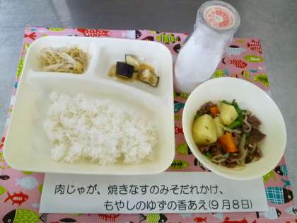 人気の定番メニュ「肉じゃが」は、米飯によく合っておいしかったです。今回の焼きなすは、シンプルになすだけを焼いたものでしたが、子どもたちは残さずに食べていました。「なすは嫌いだけど、食べたらおいしかったから、おかわりしたよ。」という児童も多かったです。