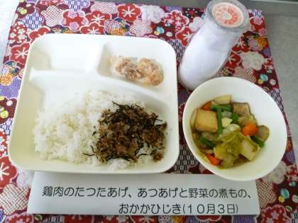 鶏肉のたつたあげは、カリッとあがって歯ごたえが良かったです。たけのこやごぼうの入った煮物は、食物繊維がたっぷり含まれヘルシーでした。おかかひじきはふりかけのようでご飯が進みました。
