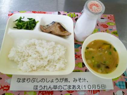 かつおの「なまりぶし」は、しょうがや料理酒で魚の臭みが消え、おいしくいただきました。みそ汁にはかぼちゃやしめじが入って季節感がありました。ほうれん草はプロの技で色美しく仕上がっていました。