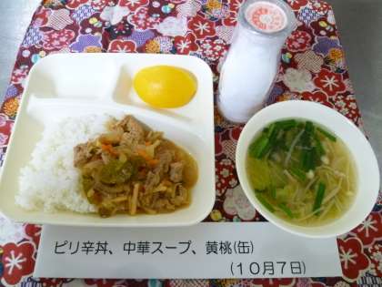 ピリ辛丼は、ほどよい味付けで野菜がたっぷり入り、ご飯が食べやすかったです。黄桃(缶)のデザートがつき、口の中がさっぱりとしました。