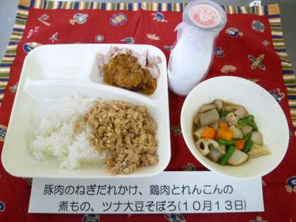 今日は大豆をそぼろ状にした「ひき割り大豆」とツナを合わせてふりかけのようにご飯にそえるメニューが出ました。ご飯が食べやすく好評でした。3年生から5年生までが遠足に出かけていたので、いつもより寂しい給食時間でした。