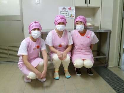 いつもは白いエプロンですが、ラッキーにんじんの日は、給食調理員さんお手製のピンクのエプロンで子どもたちに給食を手渡しています。ミッキーマウスの形のにんじんがあたったラッキーな子はだれかな?