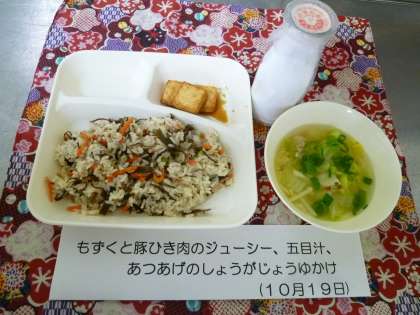 こんぶやもずくがたっぷり入ったヘルシ−な沖縄のまぜごはん「もずくと豚ひき肉のジューシー」がでました。五目汁はだしの香りよく、あつあげはしょうがじょうゆがよく合ってとてもおいしかったです。各地の郷土料理を学ぶことが今週の食の目標にもなっています。