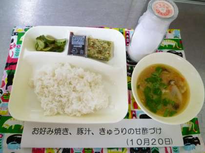 今日は大阪のメニュー、お好み焼きでした。豚汁、きゅうりの甘酢づけとの組み合わせでした。自分でとんかつソースをかけていただくお好み焼きは、量は少なかったですが、地元の味でおいしかったです。