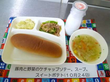 旬のさつまいもにクリームや砂糖を加えた手作りのデザートは、ホクホクしてクリーミーでおいしかったです。ソテー、スープにはたくさんの野菜が入っていました。黒糖パンは朝焼きでふわふわでした。
