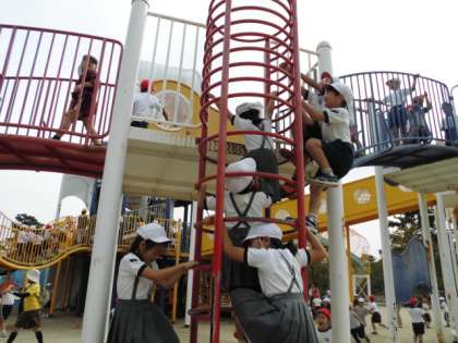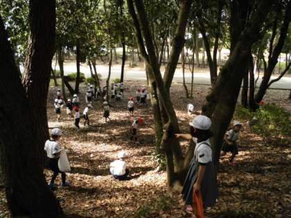 21日(金)、1・2年生で服部緑地公園へ秋の遠足に行きました。秋らしく涼しい気候の中、長いすべり台やいろいろな遊具で遊び、みんなでおいしくお弁当を食べました。その後は、どんぐりやまつぼっくりを拾いに行きました。いろいろな秋を体いっぱいに感じた遠足となりました。