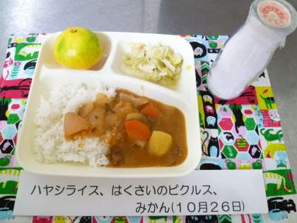 手作りのルウでとろみをつけた、ハヤシライスの給食でした。国産の牛肉と野菜のうま味が出てまろやかでとてもおいしかったです。熊本産のみかんは甘かったです。