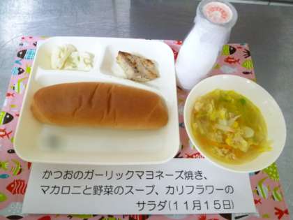 かつおのガーリックマヨネーズ焼きは、パサつきがなく、しっとりとしておいしかったです。スープにはセロリが入っていましたが、子どもたちは残さずに食べていました。旬のカリフラワーは、さっぱりとしておいしかったです。