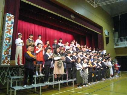 5年生の音楽劇「人間になりたがった猫」の様子です。