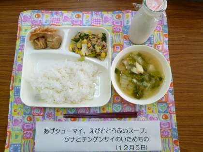 子どもたちに人気の揚げシューマイがでました。皮はパリパリ、中はジューシーでおいしかったです。えびととうふのスープは、えびのアレルギー対応メニューが提供されました。チンゲン菜の炒め物もあり彩りが良かったです。