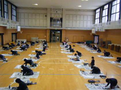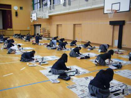 講堂の床の上に長い書き初め用の半紙を置き、「美しい空」と書きました。