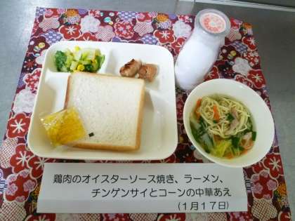 寒いときに体が温まるラーメンは大人気でした。鶏肉の焼き物と、野菜のおかずの組み合わせも良かったです。今日もみんな残さずに食べていました。